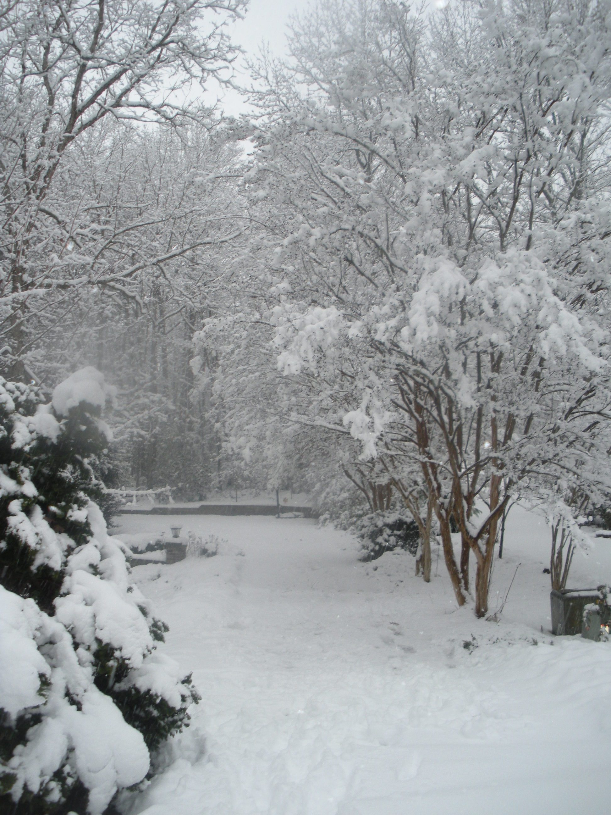 In the meantime, here’s a picture of our driveway a few years ago that reminds me of Joyce’s words near the end of The Dead: “A few light taps upon the pane made him turn to the window. It had begun to snow again. He watched sleepily the flakes, silver and dark, falling obliquely against the lamplight. The time had come for him to set out on his journey westward.”