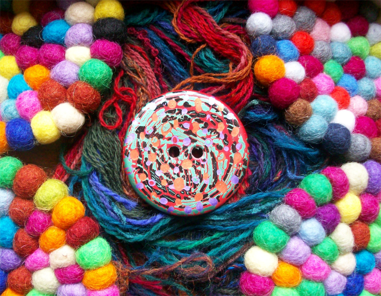 My eleventh Button Flash features a cheerful button that reminded me of a person who always finds beauty and creativity in life, a person who enjoys seeing what each day will bring . . . a person who would stubbornly see the glass as half full even if there were just a few drops left. The colors reminded me of a carnival, so I wrote a little character sketch based on a seamstress for a troupe of aerialists. So here it is–a sunny flash story of 250 words written in one hour, inspired by a button from Fran H!