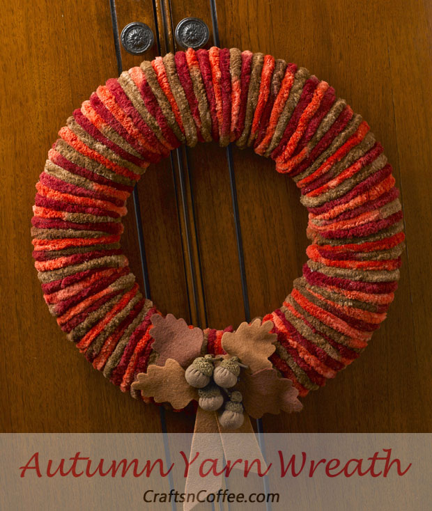 ‘Autumn Welcome’ Yarn Wreath in gorgeous shades of fall. A thick, chunky yarn is the secret to making a quick yarn wreath. Love the acorns, too.